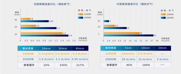 輔助氧氣條件下,在切割30mm和40mm的碳鋼時,20KW的激光切割機優(you) 勢非常明顯,切割效率比12KW的分別提升了約1.5倍和2倍。