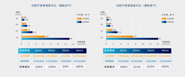 在切割不鏽鋼時,無論是輔助空氣還是氮氣,20KW的激光切割機的整體(ti) 優(you) 勢非常明顯,切割效率比12KW的提升巨大,切割10mm-40mm的不鏽鋼大部分效率都提升一倍以上。
