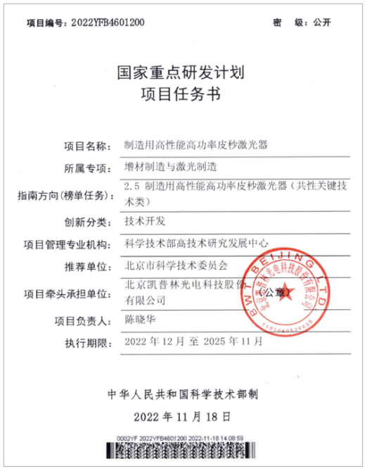 近日,科技部“十四五”國家重點研發計劃“增材製造與(yu) 激光製造”重點專(zhuan) 項立項通過公示。由凱普林董事長陳曉華作為(wei) 項目負責人牽頭申報的“製造用高性能高功率皮秒激光器”項目獲科技部立項資助。項目聯合中國科學院空天信息創新研究院、蘇州中輝激光科技、中國科學院半導體(ti) 研究所、寶山鋼鐵、杭州拓致光電科技等優(you) 勢單位合作開展研究。這是繼今年年初凱普林擔任國家某重點領域項目負責單位之後,又一次牽頭負責國家重點研發計劃項目。
