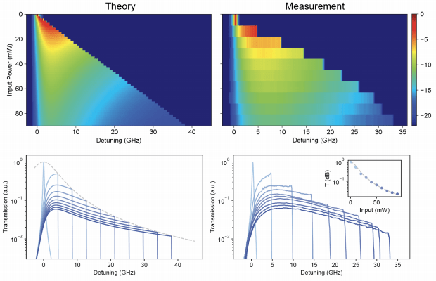 為(wei) 了測量這些設備的隔離性,我們(men) 使用圖2a所示的泵-探頭設置。由於(yu) 泵浦和探頭來自同一激光器,因此它們(men) 具有相同的光學頻率。對於(yu) 第一組測量,如圖2b,c所示,泵浦和探頭波長掃描環共振。在圖2d中,泵保持固定。我們(men) 通過環發送一個(ge) 大功率泵,同時調製並向相反方向發送一個(ge) 低功率探頭。然後我們(men) 掃描泵浦和探測共振和讀取反向傳(chuan) 輸使用鎖相放大器。在掃描過程中,泵熱拉環,直到環在共振峰值時解鎖。當激光接近環的頻率時,更多的光功率耦合到共振中。由於(yu) 一個(ge) 小的線性材料吸收,這使環加熱,使共振遠離激光。這一直持續到激光頻率匹配共振,並最大限度地耦合到環。一旦激光失諧超過這一點,環中的功率就會(hui) 開始下降,使環冷卻並坍縮到原來的共振位置。通過監測諧振峰值處的探頭傳(chuan) 輸,我們(men) 可以獲得隔離的直接測量。此外,通過改變泵浦功率,我們(men) 可以測量功率相關(guan) 的隔離(圖2b,c)。隨著泵浦功率的增加,峰值隔離被紅移,並按洛倫(lun) 茲(zi) 量縮放。我們(men) 發現,我們(men) 的測量結果(圖2b)與(yu) 一個(ge) 具有洛倫(lun) 茲(zi) 功率依賴隔離的熱拉環的簡單模型(圖2b,插圖)的預期傳(chuan) 輸之間非常一致。