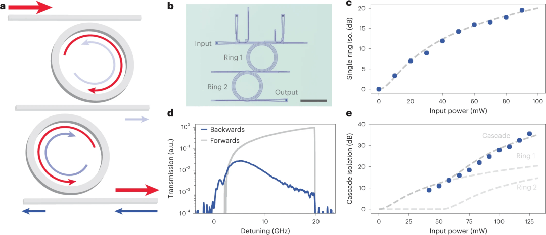 圖4:隔離級聯。a,級聯隔離環示意圖。b,製造的級聯隔離環的光學顯微照片。比例尺,200 μm。c,理論(虛線)和實驗(藍色數據點)功率相關(guan) 的單環隔離。d、級聯隔離環與(yu) 110mw泵正向和反向傳(chuan) 輸。e,理論(虛線)和實驗(藍色數據點)級聯環的功率依賴隔離。理論擬合是通過將單個(ge) 環的隔離比乘以從(cong) 第一個(ge) 環紅移的第二個(ge) 環來計算的。測量從(cong) 40mw開始,因為(wei) 需要這麽(me) 多的泵浦功率來重疊兩(liang) 個(ge) 環共振。