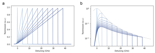 圖S3:隔離器模型。a.熱拉隔離環正向傳(chuan) 動。藍色越深,輸入功率越高。b.熱拉隔離環反向傳(chuan) 動。深藍色代表更高的泵功率。由於(yu) 失諧隨輸入功率的增加而增加,我們(men) 期望看到在每個(ge) 功率級別上具有最大失諧的洛倫(lun) 茲(zi) 傳(chuan) 輸,如虛線所示。