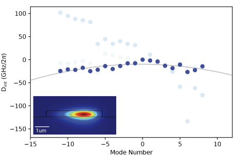 圖S2:隔離器分散。測量環形諧振腔模式的綜合色散。基本模式顯示在插圖中,圖中深藍色部分保持正常色散,允許高功率輸入泵沒有偽(wei) OPO。兩(liang) 個(ge) 高階模的色散用淺藍色表示。該環的FSR為(wei) 240.5 GHz。