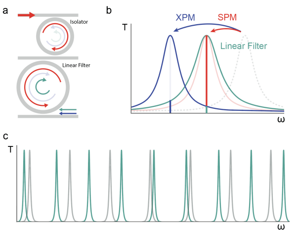 我們(men) 可以用同樣的原理來構造一個(ge) 隔離器。圖1a所示的設置。一個(ge) 強泵浦(紅色)被發送通過環形諧振腔與(yu) 簡並順時針和逆時針共振。該泵加熱環,導致折射率的熱光倒數增加和相應的共振頻率下降。此外,環中的高功率導致順時針模式的SPM和逆時針模式的XPM。這使得逆時針模式的共振位移是順時針泵浦模式的兩(liang) 倍。現在的分裂共振允許在泵浦方向上的近乎統一的傳(chuan) 輸,但實質上減少了在相反方向上的相同頻率的傳(chuan) 輸(藍色)。
