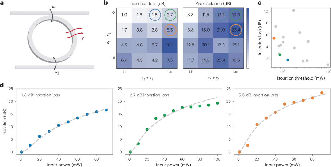 圖3:性能優(you) 化。a,隔離器環示意圖,說明關(guan) 鍵參數:κ1, κ2和γ -輸入耦合率,輸出耦合率和固有損耗率。b,熱圖顯示不同偶聯率下的插入損失和峰值隔離。色條限製由每個(ge) 圖的最小值和最大值設定(白色:1.0 db插入損耗,3.3 db峰值隔離;深藍色:10.1 db插入損耗,23.4 db峰值隔離)。表現良好的參數用藍色、綠色和橙色圓圈突出顯示。c, b的隔離和插入損失的相關(guan) 性d,三個(ge) 突出顯示環的泵功率依賴隔離。