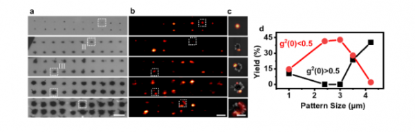 圖1.製備得到的不同尺寸缺陷結構陣列(a)及相應的光致發光圖像(b)(c)。(d)為(wei) 統計得到的不同尺寸下單光子源產(chan) 率