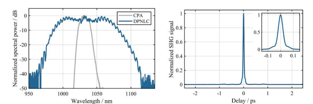 圖2:壓縮前後光譜(左圖)與(yu) 自相關(guan) 曲線(右圖)[1]