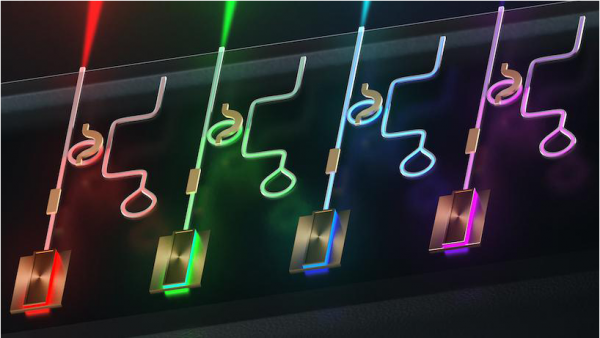 該團隊在發表在《Nature Photonics(自然光子學)》的論文中率先展示了芯片級窄線寬和可調諧激光器,用於(yu) 波長比紅色更短的光——綠色、青色、藍色和紫色。這些廉價(jia) 的激光器還具有發射可見光的任何可調諧窄線寬集成激光器中最小的體(ti) 積和最短的波長(404 nm)。