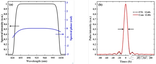 圖1.數值模擬的100PW激光放大光譜和基於(yu) 非匹配光柵壓縮器的輸出脈衝(chong) 。