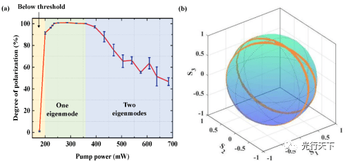 圖2.莫比烏(wu) 斯環光纖激光器的偏振特性。(a)不同泵浦功率下的偏振度。(b)單偏振狀態下,龐加萊球描繪的典型偏振態。