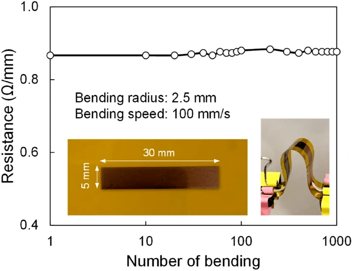 圖8:在25 μm PI上製備了尺寸為(wei) 5 × 30 mm2的方形銅,並在自製的彎曲機上進行了彎曲試驗。經過1000次彎曲(彎曲半徑為(wei) 2.5 mm)後,試樣的電阻由0.87變為(wei) ~ 0.88 Ω/mm,如圖8所示。激光燒結銅在多次彎曲作用下電阻的變化。彎曲速度為(wei) 100mm /s,彎曲半徑為(wei) 2.5 mm。