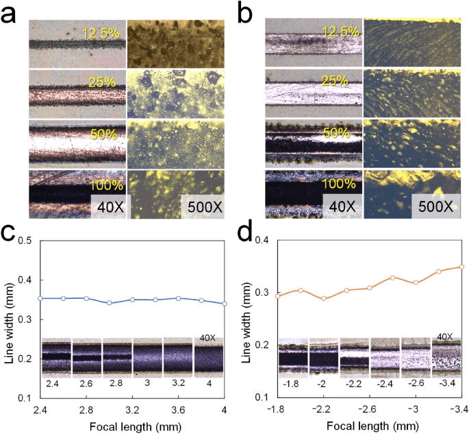 圖4:隨著輸入PWM信號比從(cong) 12.5到100%變化的圖版銅顯微鏡圖像:(a)在LFL和4 mm/s掃描速度下形成的銅線,(b)在SFL和4 mm/s掃描速度下形成的銅線。在各種SFL和LFL上形成的Cu模型的顯微鏡圖像和線寬,以尋找適當的焦距以最小化缺陷:(c)焦距(LFL)從(cong) 2.4到4 mm, (d)基於(yu) RFL的焦距(SFL)從(cong) −1.8到−3.4 mm。請注意,Cu模型是在38% PWM輸入和4 mm/s掃描速度下獲得。