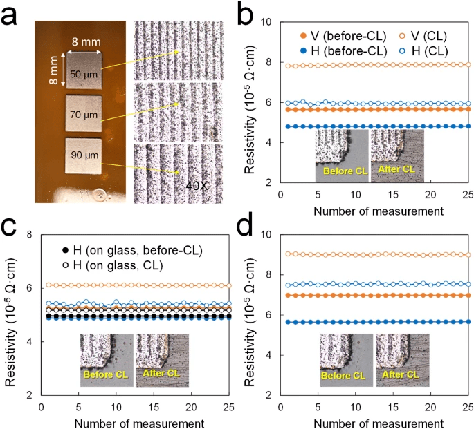 圖7:在不同掃描間隙(50、70、90 μm)和SFL下形成的Cu方形模型的電阻率:(a) PI上Cu方形(8 × 8 mm2)模型的相機圖像及其顯微鏡圖像,(b) 50 μm掃描間隙的電阻率曲線,(c) 70 μm掃描間隙,(d) 90 μm掃描間隙。請注意,電阻率圖包括相對於(yu) 激光掃描方向的垂直/水平方向的電阻率對比以及每種情況清洗前後的電阻率對比。