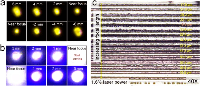 圖2:聚焦激光束:(a)使用USB相機找到激光焦距,(b)在1.6%脈寬調製(PWM)輸入信號下使用裸PI薄膜上的燃點確定焦距,(c)使用G-code程序(掃描速度為(wei) 1mm /s和2% PWM)通過在不同焦距上形成的Cu模型確定焦距。