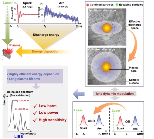 針對上述問題,該團隊提出離子動力學調製方法,對克服傳(chuan) 統D-LIBS放電能耗大、安全風險高、環境危害大等不利因素,同時提高分析靈敏度具有顯著改善效果。該工作借助這一方法,合理優(you) 化電極配置,有序調控放電模式,在有效增強光譜信號強度的同時,大幅降低放電能耗。關(guan) 鍵創新點在於(yu) :(1)首次提出並利用激光誘導等離子體(ti) 衝(chong) 擊波與(yu) 外加電場空間零弧度耦合方式,實現有效放電區域全方位覆蓋激光等離子體(ti) 中粒子的擴散方向,離子的動力學特征從(cong) 原始的向外擴散變更為(wei) 放電空間內(nei) 陽極和陰極之間的漂移運動。這種調製使得大部分離子被抓捕、約束在有效放電空間內(nei) ,促進電能與(yu) 激光等離子體(ti) 耦合,大幅降低放電能耗。(2)突破傳(chuan) 統D-LIBS方法,即僅(jin) 在電容器放電過程中輔助LIBS,將放電增強LIBS拓展到電容器放電和充電的兩(liang) 個(ge) 過程。采用直流電源與(yu) 充電電容共同作用等離子體(ti) 間隙的策略,使約束的帶電粒子在電容放電結束後繼續在電極之間漂移,並在毫秒尺度維持帶電粒子電遷移運動特性,大幅延長等離子體(ti) 壽命,進而實現火花和電弧放電的有序調控以及原子和離子光譜信號的選擇性增強。