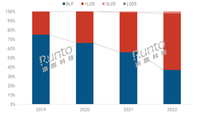 2019-2022年中國智能投影線上市場按銷量技術結構,數據來源:洛圖科技(RUNTO)線上數據,單位:%