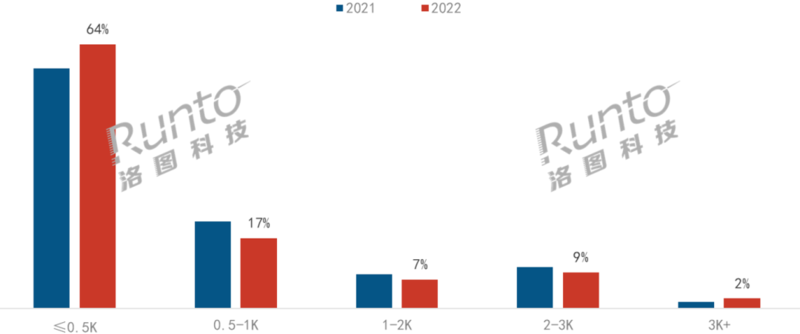 2021-2022年中國智能投影線上市場按銷量亮度結構。數據來源:洛圖科技(RUNTO)線上數據,單位:%