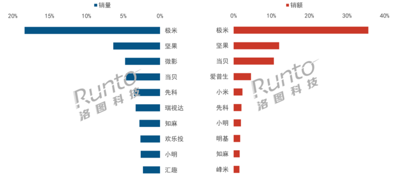 在銷額維度上,主流品牌則占據更多的市場份額。前四名極米、堅果、當貝、愛普生的合計份額(CR4)達到63.0%,市場集中度處於(yu) 寡占型。TOP10品牌中,極米、堅果和當貝保持第三的位置,愛普生升至第四;知麻、峰米、小明的漲幅較高,超過100%。