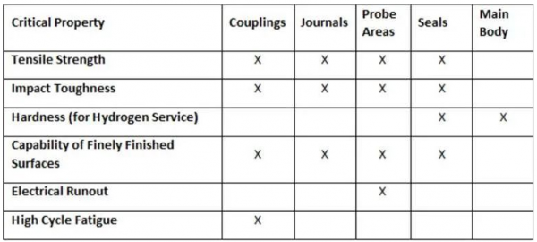 修複軸上最常見的損壞位置包括聯軸器配合、軸頸、探頭區域、密封區域和主體。由於修複過程的性質(熔敷焊縫和HAZ的形成),據了解,修複區域的特性將與原始軸材料的特性不匹配。此外,軸的每個部分都有自己的一套設計標準。因此,確保修複區域滿足每個修複位置的最低設計要求非常重要。考慮到這一點,下麵討論了軸的每個區域應考慮的關鍵特性。此信息的摘要見表 2。1.主軸體