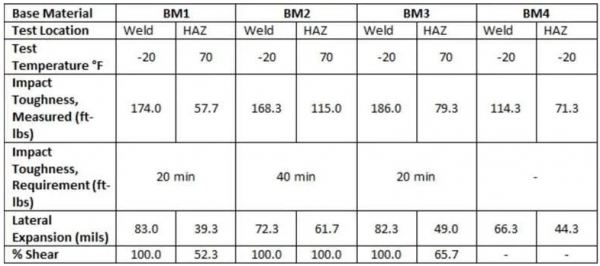 所有焊縫均通過液體滲透檢測和側彎檢測。宏觀測試也通過了檢查,這意味著它在放大5倍的情況下沒有可見裂紋。圖5顯示了LBW堆焊層的橫截麵,突出顯示了LBW覆蓋層中HAZ的小尺寸,在本研究中平均厚度為0.00975英寸。此外,LBW焊縫沉積物幹淨,沒有可檢測到的孔隙。圖像上的深色斑點來自輕微的表麵鏽蝕。表4顯示了全焊縫拉伸試驗的結果,包括屈服強度、拉伸強度、斷裂伸長率和斷麵收縮率。表 4:在焊接和PWHT條件下從全焊接金屬 (ER120S-1) 堆積中提取的試樣的拉伸試驗結果。此表列出了焊接樣品和PWHT樣品的實驗值,並包括AWS A5.28中填充焊絲的性能要求。表5是所用四種基底金屬的坡口焊縫拉伸試驗結果。測試結果包括屈服強度、抗拉強度、斷裂伸長率、斷麵收縮率和斷裂位置。表 5:使用 ER120S-1 焊絲在各種基材上進行的 V 形槽焊縫的平均拉伸試驗結果以及每種基材的機械性能要求。表 6:用 ER120S-1 在各種基材上製成的 V 形槽焊縫的平均衝擊試驗結果以及每種基材的衝擊韌性要求 。測試結果包括測試溫度、平均衝擊韌性、平均橫向膨脹和平均剪切百分比。各坡口焊縫的硬度測量結果見表 7。表7還包含每個焊縫的焊縫沉積物和HAZ 的測量厚度。表 7:用 ER120S-1 焊接的每種材料的平均維氏硬度 (HV10) 和焊縫金屬、HAZ 和母材的厚度。3.修複示例