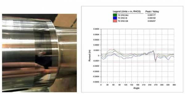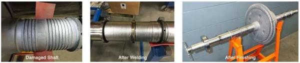 如果沒有可行的修複工藝,深度約為 0.003 英寸的劃痕會使軸變成廢料。由於需要從軸頸區域通過軸的聯接端進行焊接,因此傳統的電弧焊接派不上用場。在這種情況下,由於該位置的強度要求,在耦合區域進行焊接是不可行的。相反,激光焊接工藝用於對劃痕進行局部修複,無需在耦合區域進行焊接,同時節省了大量加工時間。修複區域的最終研磨不需要超出原始圖紙公差的額外切削量。2.覆蓋修複