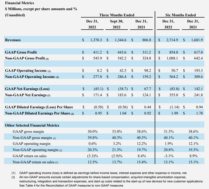 Coherent高意董事長兼首席執行官Vincent D. Mattera博士表示:“2023財年第二季度延續了我們(men) 作為(wei) Coherent公司的新篇章的良好開端。盡管供應鏈麵臨(lin) 持續挑戰,但憑借材料、網絡和激光器這三個(ge) 業(ye) 務部門的堅實貢獻,我們(men) 實現了創紀錄的季度營收13.7億(yi) 美元,同比增長70%,有機增長23%。我們(men) 在本季度償(chang) 還了1.33億(yi) 美元的債(zhai) 務。”