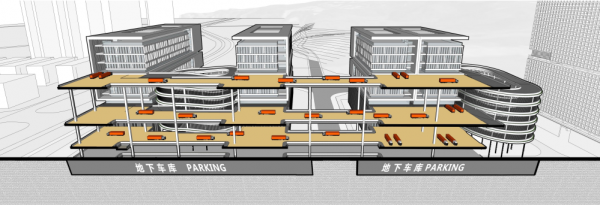 二是層高預留了未來生產(chan) 的需求高度。考慮到先進製造業(ye) 的生產(chan) 需求,層高定為(wei) 首層8m,2-9層6m,10-16層4.5m。三是樓層承重標準較高。該項目廠房的荷載標準為(wei) 首層2.0噸,2、5、9層為(wei) 1.5噸,10層及以上為(wei) 0.8噸,其他層為(wei) 1.0噸。這些負荷標準能滿足絕大部分企業(ye) 生產(chan) 需求,荷載要求高的企業(ye) 可入駐低樓層。四是采用了盤道和高架平台,裝卸貨可直通各樓層。借鑒裕廊“趨勢工廠”經驗,通過盤道連接各個(ge) 樓層。每棟建築由3個(ge) 三層單元堆疊,2、5、9層架設高架平台,功能效果與(yu) 首層相似。第9層平台有吊裝重型設備的預留位置。同時2、5、9層預留有卸貨平台及貨車停車位。貨車經盤道到達對應樓層平台卸貨搬運,可大大縮減貨運時間。