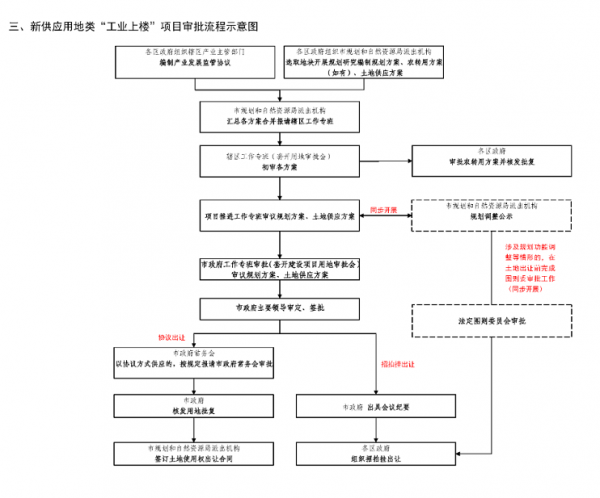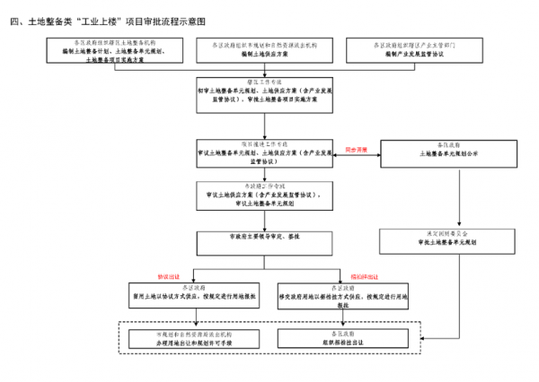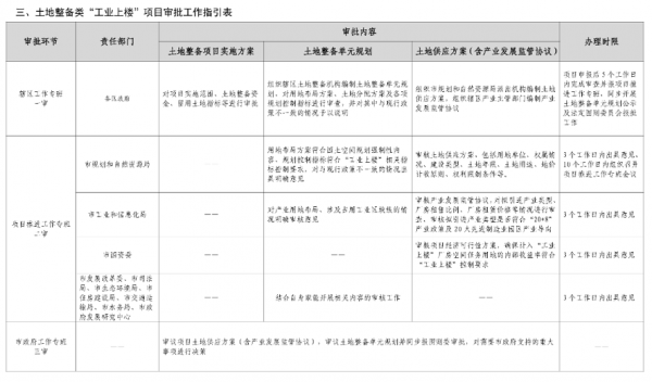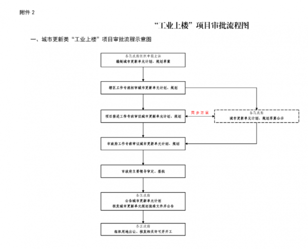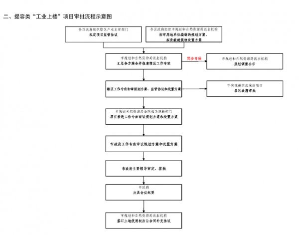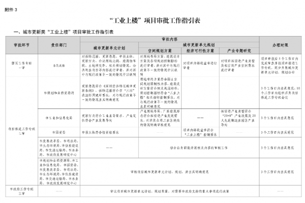 政府統籌、市場運作。市政府高位部署,職能部門政策支持, 各區政府強力推進,共同推動“工業上樓”項目落地。國有企業帶頭參與,充分調動國有企業、民營企業等各方麵的積極性,發揮建設、運營、管理優勢,體現責任擔當,主動推進項目實施。分級聯審、封閉運行。建立“市政府—職能部門—各區政府” 的三級聯審製度,同一層級審批事項通過專班會議一次性審議通過,提高審批效率。納入“工業上樓”的項目封閉運作,各區各部門依法依規、守正創新、提高效率,加快工作任務順利完成。一園一策、政策支持。嚴格貫徹落實市政府工作部署,在“保本微利”的前提下,按照“一園一策”“一項目一方案”,用足用好規劃、土地、更新、整備、財稅、金融等政策手段,強化政策支撐。 按照“1+1+12”的架構成立“工業上樓”推進工作專班,組織架構具體如下:成員單位:市發展改革委、市工業和信息化局、市規劃和自然資源局(市城市更新和土地整備局)、市司法局、市國資委、市政府發展研究中心,各區政府,市前海管理局。市政府工作專班主要職責:審議“工業上樓”年度任務、年度項目計劃,決策重大事項,套開市政府建設項目用地審批會,審議或審批項目規劃方案、土地供應方案等。成員單位:市規劃和自然資源局(市城市更新和土地整備局)、市工業和信息化局、市發展改革委、市司法局、市生態環境局、市住房建設局、市交通運輸局、市水務局、市國資委、 市政府發展研究中心、各區政府。項目推進工作專班主要職責:各成員單位按各自職能分工對項目方案開展審核工作。工作專班總召集人(或委托副總召集人) 不定期召開專班會議,協調項目存在問題,審議項目規劃方案、土地供應方案等。成 員 單 位:各區政府相關職能部門、市相關部門派出機構等,具體由各單位自行確定。轄區工作專班主要職責:按照審批工作指引(附件 1—3),負責項目規劃方案、土地供應方案等的擬訂和初審工作,以及城市更新單元計劃、規劃等的報批、公示、公告等工作。本方案僅針對已經市政府批準納入“工業上樓”目錄的項目,根據實施路徑分為城市更新類項目、提容或新供應用地類項目、土地整備類項目三種類型。(一)市規劃和自然資源局(市城市更新和土地整備局)。負責項目推進工作專班的日常工作,代專班擬定相關文件, 明確項目的審批流程和審批要求,結合自身職能對項目方案開展審核工作。負責年度項目目錄製定及項目運行信息化平台建設,結合自身職能對項目產業布局和導入開展審核工作。會同各區政府建設CIM+BIM 項目信息化平台、開展招商引資工作,對項目產業導入、自持廠房比例及租賃價格等事項實施監管,指導簽訂監管協議。協調推動國有企業參與“工業上樓”項目建設,結合自身職能會同各區政府對項目經濟可行性方案開展審核工作,並指導製 定項目投融資方案。製定項目實施後的成本收益核算規則,以內部收益率控製指標為基準,明確相關的收益調配機製。負責將“工業上樓”項目納入年度固定資產投資計劃和市政府重點工程予以推進和管理,結合自身職能對項目開展審核工作。負責定期對項目運行情況進行跟蹤研究,結合國內外“工業上樓”的先進做法,對“工業上樓”政策提出優化建議。負責轄區內“工業上樓”年度計劃及項目的申報工作,負責項目規劃方案、土地供應方案等的擬訂和初審,以及城市更新單 元計劃、規劃等的報批、公示、公告等工作,統籌推進項目的具 體實施、產業招商、運營管理及後續監管等工作。針對各類型項目的規劃方案、土地供應方案等事項建立“三 審一簽”的審批機製。一審由各轄區工作專班按批次開展項目初審;二審由各區政府報送項目推進工作專班會議審議;三審由項目推進工作專班統籌匯總後報市政府工作專班會議審議;一簽由市政府工作專班提請市政府主要領導審定、簽批。審批具體流程及要求詳見本方案附件 1—3。位於前海深港現代服務業合作區範圍內的項目參照上述程序,由市前海管理局完成規劃方案、土地供應方案(含產業監管協議)擬定、初審(一審)及審核(二審)工作後,報請市政府工作專班會議審議。本方案自印發之日起施行,有效期 5 年,期間可結合項目運行情況適時開展修訂工作,相關部門及時總結經驗製定新政策並對現行政策進行清理。為加快推進“工業上樓”項目審批工作,優化工作流程,提升工作效能,特製定本工作指引。按照市政府工作部署,根據實施路徑分為城市更新類、提容或新供應用地類、土地整備類三種類型,具體流程及要求如下:各區政府及其城市更新機構可同步推動城市更新單元計劃和規劃的製定、審查、征求意見、公示、報批、公告等工作,進一步提高行政審批效率。 城市更新單元計劃申報主體依據《深圳經濟特區城市更新條 例》、省“三舊”改造標圖建庫政策等相關要求製定城市更新單 元計劃並按規定開展計劃申報工作。 轄區工作專班負責單元計劃的初審工作,確保更新意願符合《深圳經濟特區城市更新條例》相關要求、拆除範圍符合省“三舊”改造標圖建庫相關要求,並對城市更新單元計劃在合法用地比例、更新方向、建築物年限、土地移交率、上層次規劃、相關 規劃控製區域占用及調整等方麵與現行政策不一致的情況予以 說明,涉及占用工