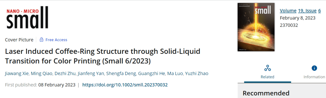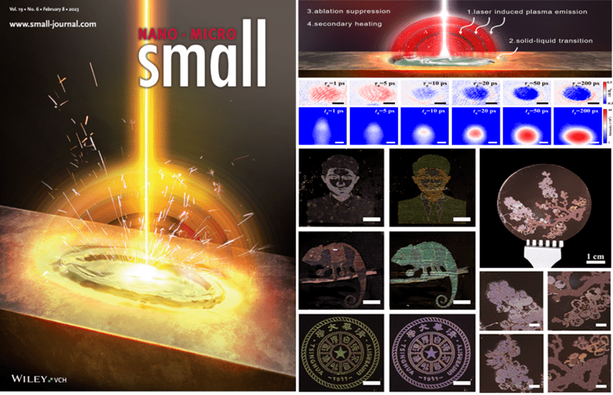 清華大學在激光微納製造研究取得進展,相關(guan) 研究成果以“Laser Induced Coffee-Ring Structure through Solid-Liquid Transition for Color Printing”為(wei) 題發表在國際學術期刊《Small》(2023, 19, 2205696),並被選為(wei) 期刊封麵文章 (front cover)。