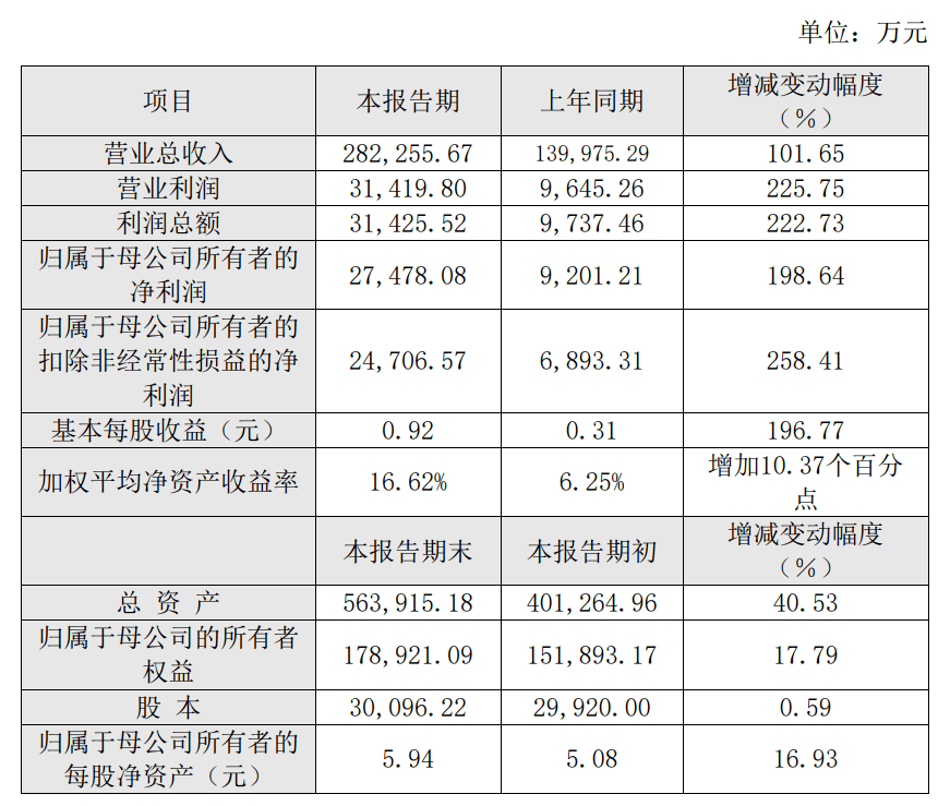 2、歸屬於(yu) 母公司所有者的淨利潤同比增長198.64%,歸屬於(yu) 母公司所有者 的扣除非經常性損益的淨利潤同比增長258.41%,基本每股收益同比增長 196.77%,主要係報告期公司營業(ye) 總收入增加,規模效應致利潤大幅增長。
