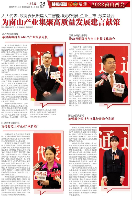 我本次的提案為(wei) “推動南山區上市公司高質量發展的建議”,旨在推動和促進我們(men) 的政府發揮區內(nei) 自身比較優(you) 勢,在著力打造“14+7”戰略性新興(xing) 產(chan) 業(ye) 集群的過程中,充分發揮好區內(nei) 上市公司行業(ye) 龍頭的引領作用,發揮上市公司產(chan) 業(ye) 集群效應,支持打造上市企業(ye) 的“成長鏈”,為(wei) 南山區乃至深圳市實現科技自主創新引領經濟高質量發展貢獻政協力量。