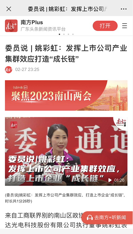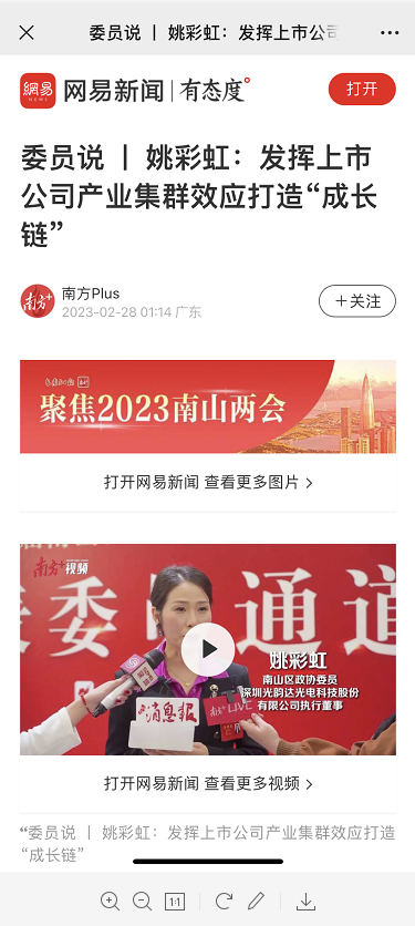 聽取政協全會(hui) 和人大會(hui) 議政府工作報告後,深圳光韻達光電科技股份有限公司聯合創始人、執行董事姚彩虹女士受邀接受委員訪談環節的記者采訪。