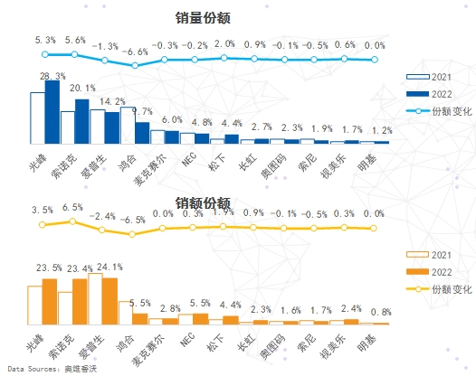 隨著激光顯示技術的發展及國內(nei) 企業(ye) 的持續創新和投入,以往一直由國外品牌主導的激光投影市場格局已經開始改變。根據洛圖科技數據,2021 年中國大陸激光投影市場,國內(nei) 品牌首次進入工程投影市場的前三。至2022年,本土品牌開始完成逆襲,奧維睿沃(AVC Revo)2022年《中國大陸激光投影市場研究報告》顯示,2022年激光投影教育市場,光峰科技銷量份額為(wei) 28.3%,排名第一,銷額份額23.5%,排名第一。工程市場,光峰科技銷量份額為(wei) 14.5%,排名第一。