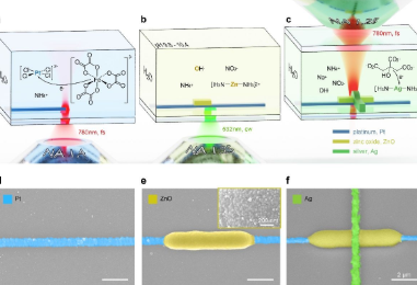 圖1:金屬/半導體(ti) 材料激光複合打印。a,d:金屬鉑;b,e:氧化鋅半導體(ti) ; c,f:金屬銀。