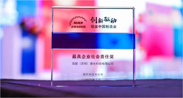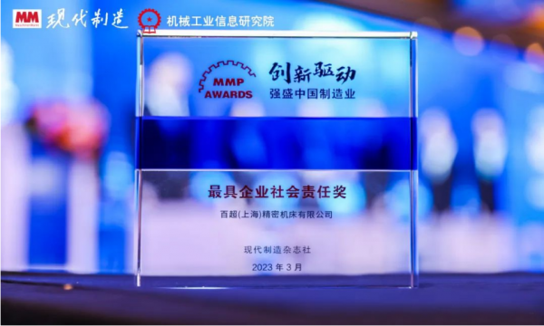 2023年3月10日,由全球知名傳(chuan) 媒集團弗戈工業(ye) 媒體(ti) MM《現代製造》舉(ju) 辦的“創新驅動·強盛中國製造業(ye) ——傑出本土化服務商&最具企業(ye) 社會(hui) 責任(CSR)獎”頒獎典禮在上海盛大舉(ju) 行,百超中國雙品牌(百超、百超迪能)憑借傑出產(chan) 品、優(you) 質服務、社會(hui) 責任的突出表現,以及在長期經營發展過程中持續節約能源、降低碳排放的品牌形象,榮獲“傑出本土化服務商&最具企業(ye) 社會(hui) 責任獎”。