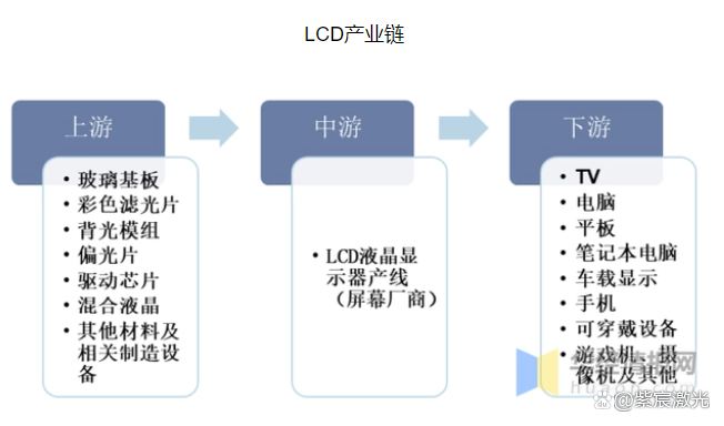 LCD麵板產(chan) 業(ye) 可以分為(wei) 上遊基礎材料、中遊麵板製造以及下遊終端產(chan) 品。其中,上遊基礎材料包括:玻璃基板、濾光片、偏光片、液晶、驅動芯片等;中遊是LCD液晶顯示器產(chan) 線;下遊終端產(chan) 品包括:電視、電腦、手機和其他消費類電子。