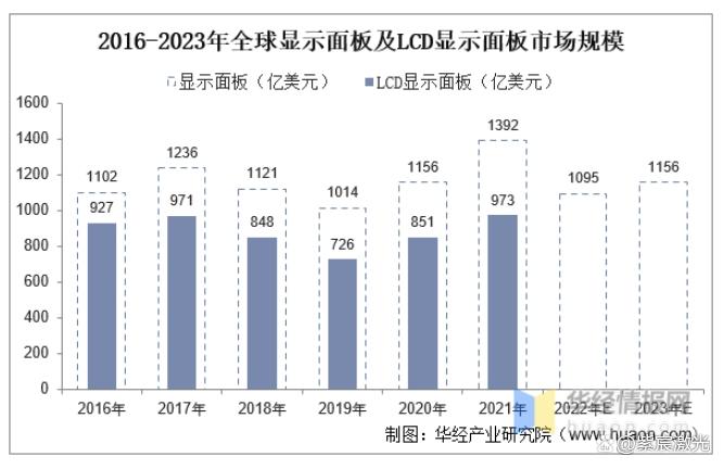 從(cong) 全球LCD顯示麵板行業(ye) 市場規模來看,據相關(guan) 數據統計,2021年全球顯示麵板行業(ye) 市場規模達到1392億(yi) 美元,其中LCD顯示麵板市場規模為(wei) 973億(yi) 美元。預計2022年全球麵板市場規模將會(hui) 下降至1095億(yi) 美元,同比下滑21.40%,2023年市場規模將小幅回升至1156億(yi) 美元。