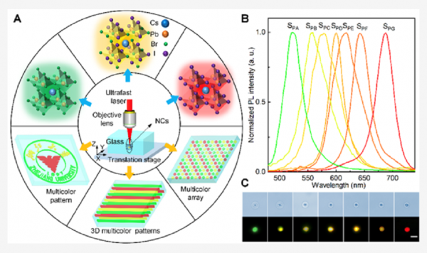 據介紹,當將飛秒激光聚焦到材料內(nei) 部時,會(hui) 產(chan) 生各種高度非線性效應,這種極端條件下光與(yu) 物質相互作用充滿未知和挑戰。邱建榮教授團隊及其合作者們(men) 發現了飛秒激光誘導複雜體(ti) 係微納結構形成的新機製。以含氯溴碘離子的氧化物玻璃體(ti) 係為(wei) 例,實現了玻璃中具有成分和帶隙可控發光可調的鈣鈦礦納米晶3D直接光刻,呈現紅橙黃綠藍等不同顏色的發光。形成的納米晶在紫外線輻照、有機溶液浸泡和250℃高溫環境中表現出顯著的穩定性。並進一步演示了這種3D微納結構在超大容量長壽命信息存儲(chu) 、高穩定的最小像素尺寸微米級的Micro-LED列陣,實現了1080p級別動態立體(ti) 彩色全息顯示。該成果揭示了飛秒激光誘導空間選擇性介觀尺度分相和離子交換的規律,開拓了飛秒激光三維極端製造新技術原理。