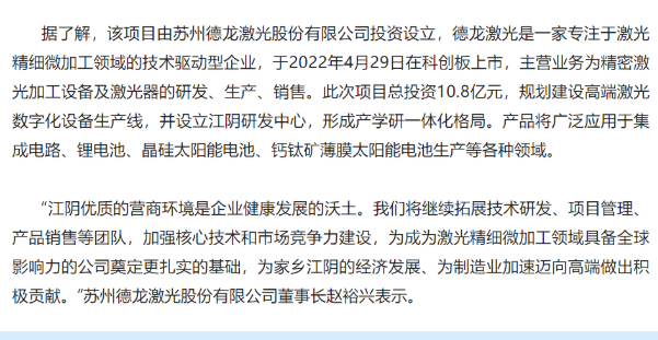 據了解,該項目由蘇州德龍激光股份有限公司投資設立,德龍激光是一家專(zhuan) 注於(yu) 激光精細微加工領域的技術驅動型企業(ye) ,於(yu) 2022年4月29日在科創板上市,主營業(ye) 務為(wei) 精密激光加工設備及激光器的研發、生產(chan) 、銷售。此次項目總投資10.8億(yi) 元,規劃建設高端激光數字化設備生產(chan) 線,並設立江陰研發中心,形成產(chan) 學研一體(ti) 化格局。產(chan) 品將廣泛應用於(yu) 集成電路、鋰電池、晶矽太陽能電池、鈣鈦礦薄膜太陽能電池生產(chan) 等各種領域。