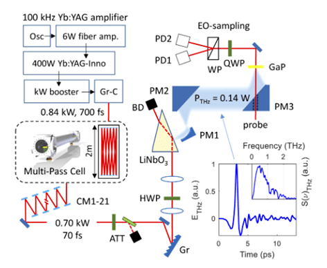 美國加速器國家實驗室主要工作是基於(yu) 多通腔壓縮的近千瓦級激光源利用光整流的方法來產(chan) 生高重頻高功率THz脈衝(chong) 。實驗裝置如圖1所示,振蕩器輸出脈衝(chong) 利用光纖放大器放大到6W,然後用Yb:YAG板條放大至1.39kW, 光斑縮束後入射到多通腔中進行光譜展寬,之後利用啁啾鏡產(chan) 生寬度為(wei) 70fs的脈衝(chong) ,平均功率約為(wei) 700W。其中99%的壓縮脈衝(chong) 作為(wei) 後續光整流的泵浦脈衝(chong) ,1%作為(wei) 探測脈衝(chong) 通過電光采樣測量產(chan) 生的THz脈衝(chong) 。泵浦脈衝(chong) 經過光柵實現波前傾(qing) 斜,再經過兩(liang) 個(ge) 焦距分別為(wei) 151mm和80mm的柱麵透鏡調節至正確的傾(qing) 角後入射到铌酸鋰晶體(ti) 中,產(chan) 生的THz脈衝(chong) 經過三個(ge) 離軸拋物鏡分別擴束、準直、聚焦到GaP中進行電光采樣來測量THz電場。