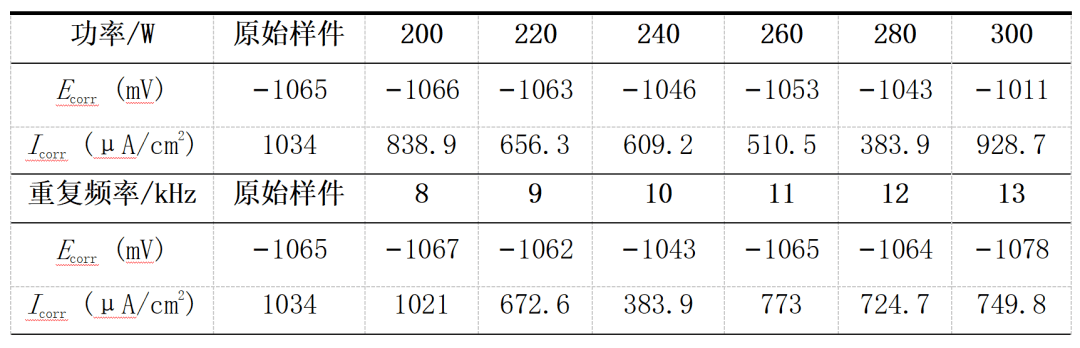 圖15為(wei) 不同激光參數下測試出的動電位極化曲線(Potentiodynamic Curve),將試驗數據采用塔菲爾擬合(Tafel Fit)處理,得到表15所示的不同參數下樣件表麵的自腐蝕電位(Ecorr)和腐蝕電流密度(Icorr)。自腐蝕電位高低反映了電化學腐蝕條件下,樣件的熱穩定特性。而腐蝕電流密度大小反映了發生電化學腐蝕的速率以及樣件表麵產(chan) 生點蝕現象的難易程度。