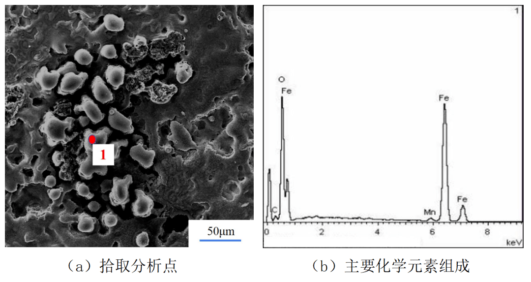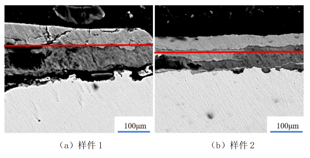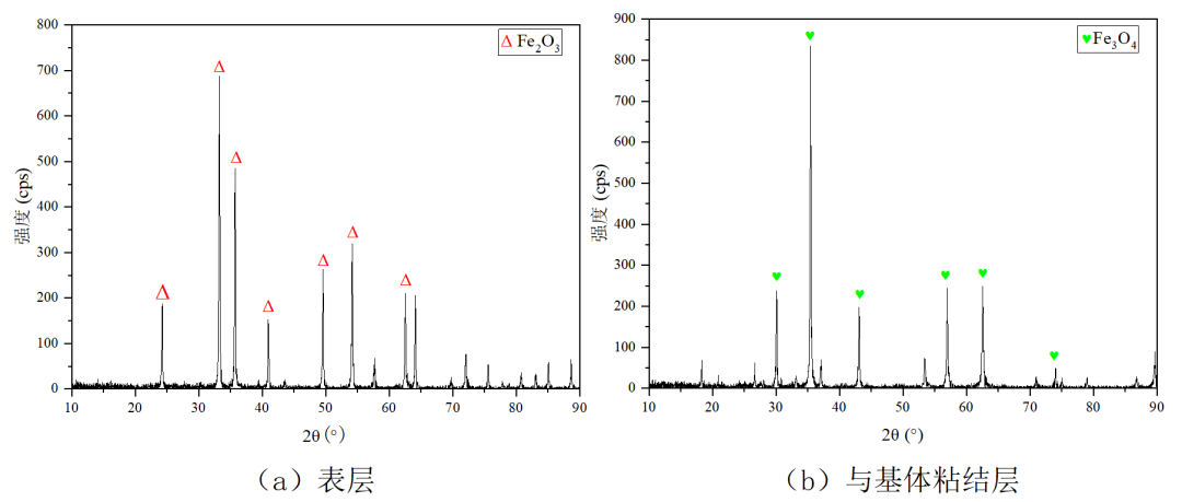 對於(yu) 測試樣件的剖麵方向,如圖6示。基體(ti) 表層的不同汙物成分間存在明顯的界限,即存在兩(liang) 層不同成分的氧化層。進一步采用X射線衍射儀(yi) (XRD)對各層的化合物成分進行測定,存在外鏽層和內(nei) 鏽層,即外鏽層為(wei) 稀疏的Fe2O3,內(nei) 鏽層為(wei) Fe3O4與(yu) FeO(少量)的混合物,工作狀態的差異會(hui) 導致氧化層的致密程度等性質有所差異。