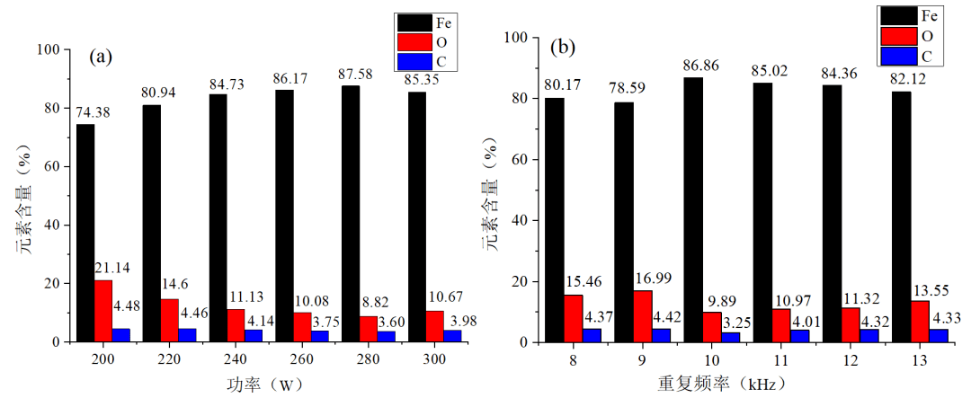 圖13(a)為(wei) 不同激光功率下Fe、O、C三種元素的相對含量。隨著的增加,Fe元素的含量呈現先上升後下降的趨勢,O元素含量呈現先下降後上升的趨勢,清洗過程中C元素含量基本保持不變。繼續升高功率,O元素含量最低為(wei) 8.82%,Fe元素含量最高為(wei) 87.58%,樣件清洗效果最好,清洗效率最高。激光功率繼續,Fe-O元素中O元素含量略有上升,證明此時激光處於(yu) 過清洗狀態,樣件表麵發生二次氧化現象,清洗效率有所下降。實際上,當重複頻率固定後,功率的變化代表了激光單脈衝(chong) 能量的變化,單脈衝(chong) 能量過高和過低都會(hui) 對清洗效率產(chan) 生不利影響。