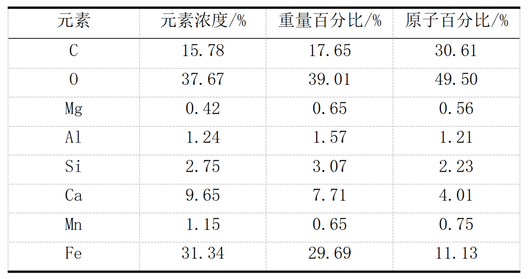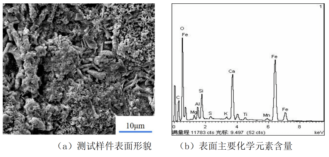 采用礦山機械鏽蝕件作為(wei) 試驗樣件,采用能譜分析儀(yi) (EDS)測定待清洗樣件表麵主要的化學元素,測試樣件及主要化學元素組成如圖5及表2所示。