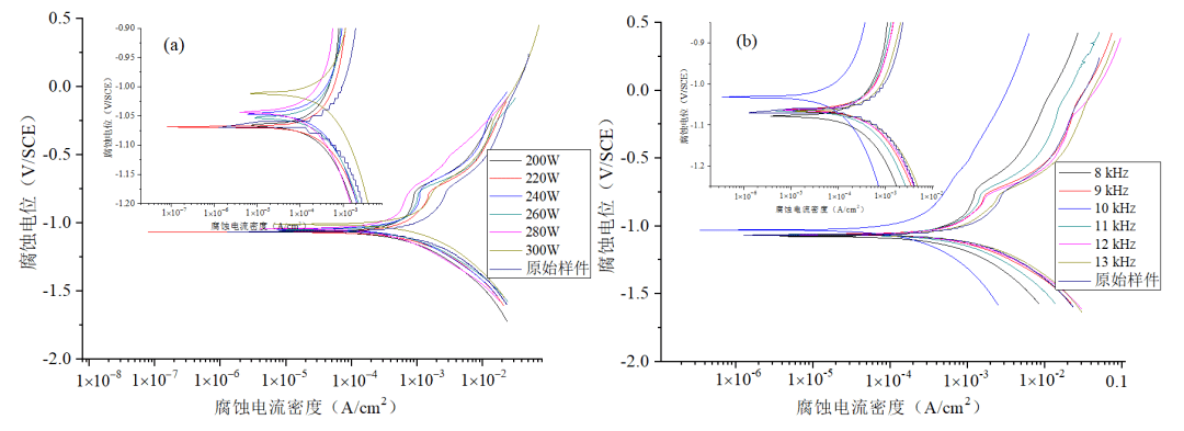 由圖15(a)以及表3可以看出,隨著激光功率的增加,極化曲線均呈現正向移動趨勢,自腐蝕電位逐步增大,即清洗後樣件表麵的腐蝕動力小幅增強。腐蝕電流密度先減小後增加,表示樣件表麵的抗腐蝕性能先增加後減小。激光功率增加,腐蝕電流密度最低為(wei) 383.9,抗腐蝕性能最佳,此時極化曲線中鈍化區的鈍化平台較寬,樣件的鈍化狀態較穩定。抗腐蝕性逐漸增加的主要原因為(wei) 激光使樣件表麵疏鬆鏽蝕氧化物去除的同時,對基體(ti) 會(hui) 產(chan) 生不同程度的熱影響,細化晶格,提高表麵完整性,從(cong) 而抗腐蝕性能得到改善。當功率最大時,由微觀形貌可知,熱累積量過高,表麵出現燒蝕坑,熔融物增加,基體(ti) 發生損傷(shang) ,抗腐蝕性下降。