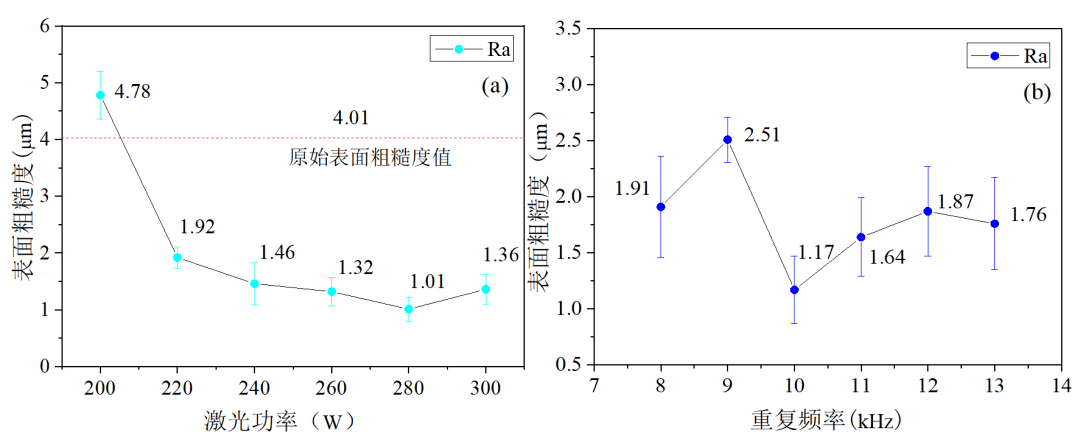 圖9鏽蝕樣件不同激光參數清洗後的表麵粗糙度(a)功率;(b)重複頻率;