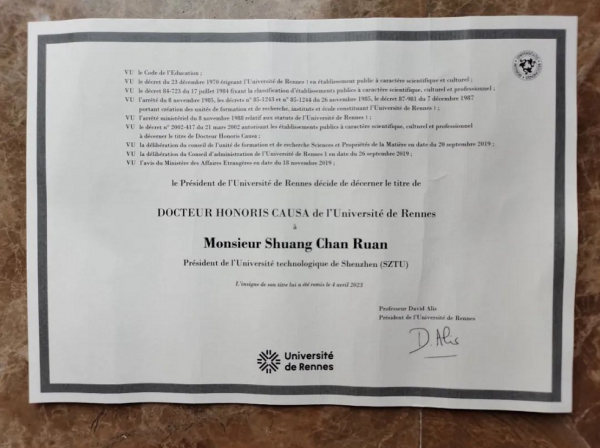 當地時間4月4日下午,法國雷恩大學校長David Allis教授為(wei) 深圳技術大學校長阮雙琛教授舉(ju) 行榮譽博士授予儀(yi) 式,授予阮雙琛教授雷恩大學材料與(yu) 光學領域榮譽博士稱號。這是法國大學給予國外學者的最高榮譽,深圳技術大學代表團與(yu) 雷恩大學師生共同見證了這一難忘時刻。