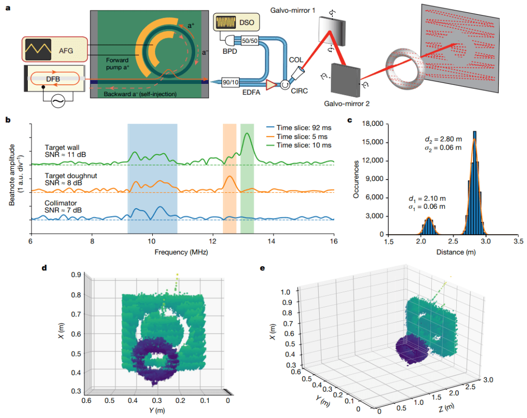 圖4:使用混合集成激光器的相幹調頻連續波frequency-modulated continuous-wave,FMCW激光雷達演示。