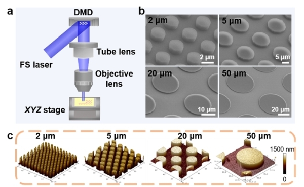 圖1.飛秒激光無掩膜投影光刻示意圖及製備的微盤陣列拓撲結構