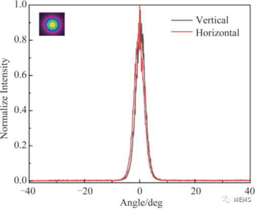在-10℃溫度下VECSEL在泵浦功率為(wei) 5 W時的輸出遠場分布,插圖為(wei) 輸出光斑二維彩圖